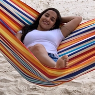 | Quality fabric hammocks from Brazil are valuable well known products. There are many sizes in exclusive strong fabrics and of course in colorfast combinations. Fabric hammocks are an outstanding product. In quality these fabric hammocks exceed any other hammocks on the market from both Asia and Latin America. Hammocks, hammock chairs, hammocks with wooden sticks and Mexilazy bean bags are all available in the exact same fabric, if so desired. There are good offers and deals on many of the hammocks. Fabric hammocks from Brazil provide good strength and quality. Fabric Hammock - Made in Brazil |