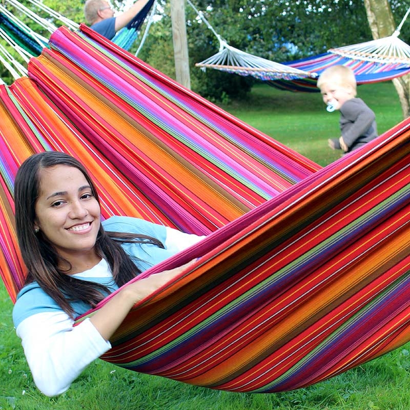 Unique innovation in color fastness in strong fabric hammocks for institutional use. A quality and size hammock meets all the wishes of children's play and enjoyment.