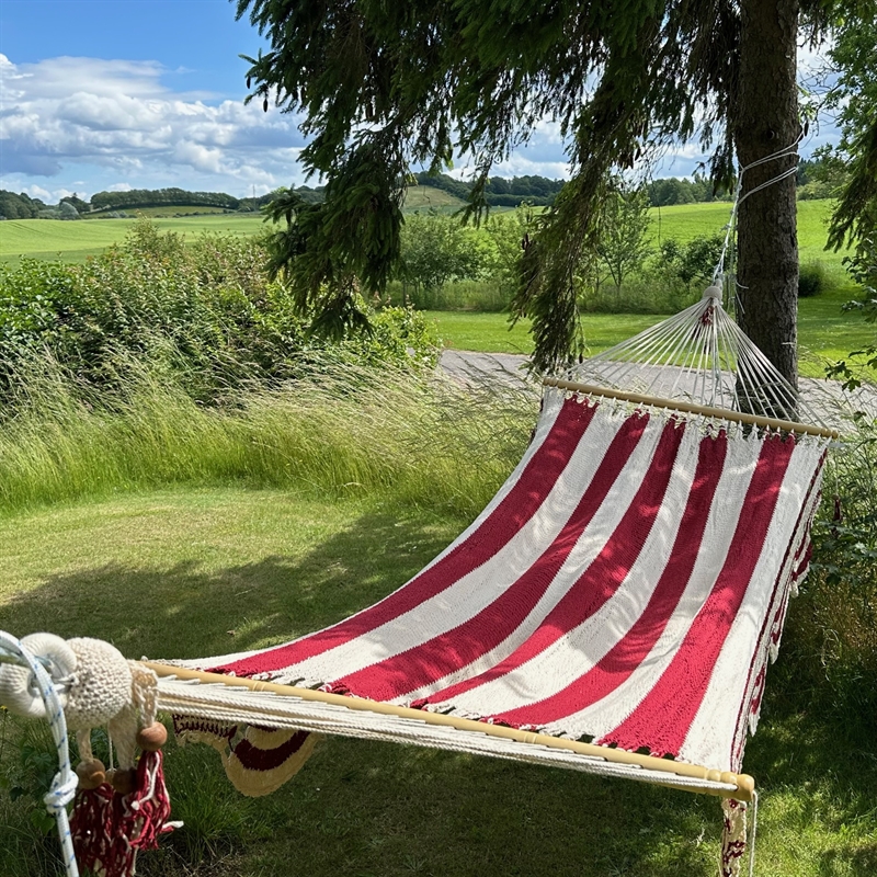 Extra big Nica Deco-Deluxe hammock. Long and exclusively spacious and a real enjoyment for any garden or park. A garden furniture that will give you exceptional experiences. Spectacular manufactured handicraft for connoisseurs. A most coveted model, which is often hard to find.
