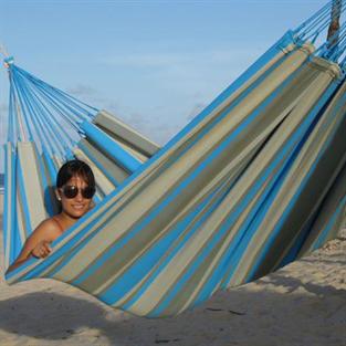 Soft pastel colored fabric hammock for the outdoor life. Great quality and nice colors. The hammock is wide and comfortable. A very popular hammock in a simple and beautiful style.